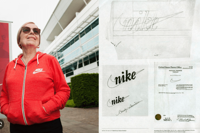 Para el logo, Phil Knight contactó a Carolyn Davidson, estudiante de diseño gráfico en la Portland State University, donde Knight enseñaba contabilidad. Le pidió crear un logo que transmitiera movimiento. El brief era mínimo: «algo que pareciera moverse».